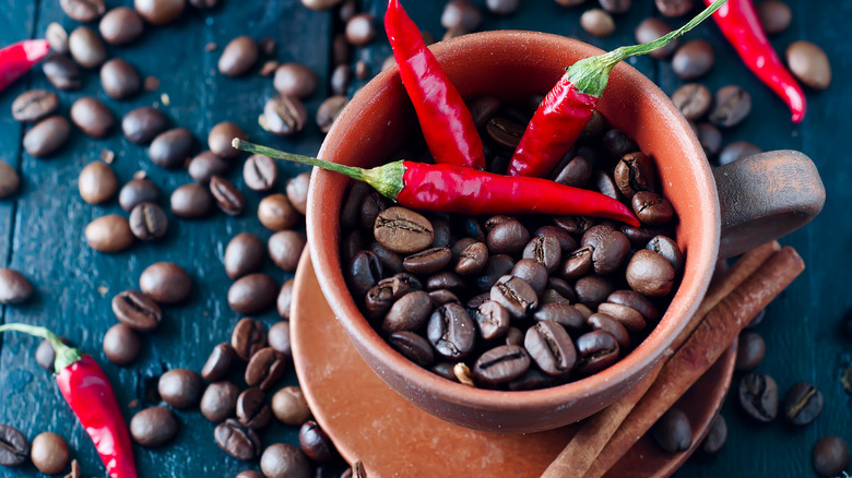 Both coffee and cayenne pepper are known for their health benefits. According to nutrition experts at Johns Hopkins University School of Medicine, the antioxidants and other active substances found in coffee may reduce inflammation and help decrease your odds of developing certain cancers and diseases. Cayenne pepper, on the other hand, is a good source of vitamins, most notably vitamin A, which is important for vision, reproduction, immune system health, and certain organ functions, according to Cleveland Clinic. Capsaicin, which is found in cayenne pepper, is also believed to reduce inflammation and relieve pain, among other benefits (via Medical News Today). Please note, that if you struggle with heartburn, stomach ulcers, or acid reflux, check with your healthcare provider about how much of this drink you can consume.