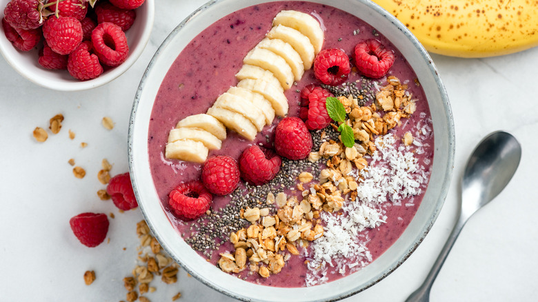 Grain bowls, granola bowls, Buddha bowls ... bowl food is having a moment, and the smoothie bowl is perhaps the most ubiquitous of them all. A smoothie bowl contains a hodgepodge of super healthy ingredients, starting with a creamy, blended base and finished off with just about any toppings you can think of. Because they're usually served in, well, bowls, these are a little less portable than regular smoothies — but on the plus side, you can top off a smoothie bowl with certain ingredients that don't blend as well into a run-of-the-mill shake, like granola or chocolate chunks. Given that it's both packed with nutrients and a striking shade of purplish blue, acai puree makes for a nutritious, delicious, and Instagram-worthy addition.