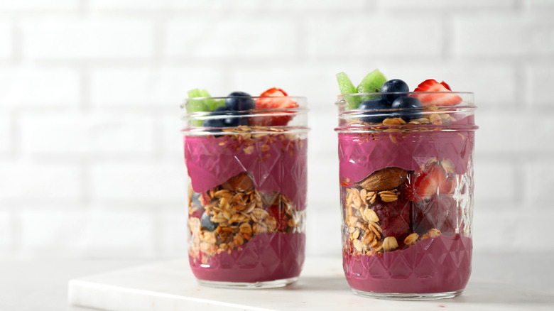 Oatmeal lovers, rejoice because a study from Michigan State University revealed that steel-cut oats fall in the low to medium range of the glycemic index — and they just so happen to pair beautifully with acai. Berries, of course, are a common pairing with oatmeal of all types, and acai lends a perfect balance of dark berry and bitter cacao flavor to the mix. Steel-cut oats are very affordable and easy to find in most supermarkets. The fiber-packed whole grain can be prepared via stovetop, Instant Pot, microwave, or even in a Mason jar for overnight oats, which make for a great breakfast on the go. Topping off your oatmeal with a generous serving of acai puree provides a double whammy of heart-healthy goodness.