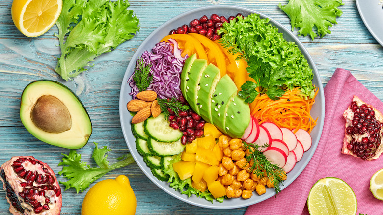 One of the best ways to make sure you're eating the rainbow is to throw together a salad or grain bowl brimming with leafy greens (spinach, kale, arugula), starchy vegetables (sweet potatoes, beets, green peas), and healthy fats (avocado, olive oil, nuts and seeds) which you can then top off with made-from-scratch acai salad dressing. Simply whisk together acai juice with olive oil, vinegar, and any citrus, herbs, or seasonings you see fit and you've got the purple portion of the rainbow covered.