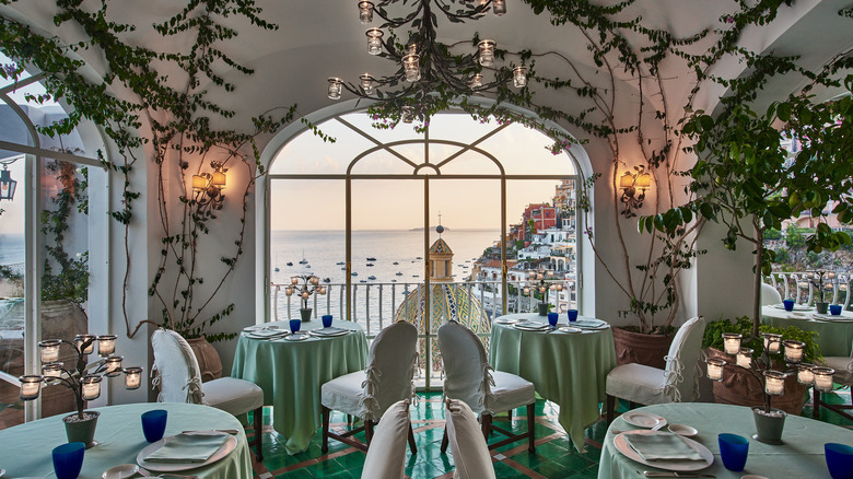 Ristorante La Sponda is located at Le Sirenuse, arguably one of the Amalfi Coast's most iconic hotels — if not one of the most iconic in Italy. The Michelin-starred restaurant is dedicated to highlighting the best culinary traditions and local ingredients of Neapolitan cuisine while offering breathtaking coastal views at every turn. Plus, the biophilic design that allows nature's color palette to shine sets a soothing tone for the afternoon or evening. Whether you dine indoors or out, there's plenty of ambiances to be enjoyed as Big 7 Travel reports the restaurant is lit with 400 candles each evening, setting the ivy-colored walls aglow as live music fills the restaurant. It's no wonder the publication considers La Sponda to be one of Europe's most romantic restaurants.