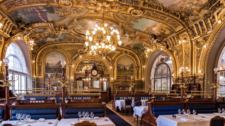 According to Galerie, which considers Le Train Bleu to be one of Paris's most beautiful restaurants, the destination was built to welcome guests of the 1900 World's Fair. Vaulted ceilings feature original murals representing French regions and showcasing the country's pride, rich history, and strong cultural traditions. Sure enough, find yourself enjoying a meal here, and you might feel as if you were plucked from real life and set into a cinematic scene. Guests are instantly transported to France's legendary Belle Epoque period as they dine on the best produce from Southwest France, meats carved and flambeed at the table and signature cocktails that draw people all over the city for happy hour. Le Train Bleu is open daily for breakfast, lunch, happy hour, and dinner.