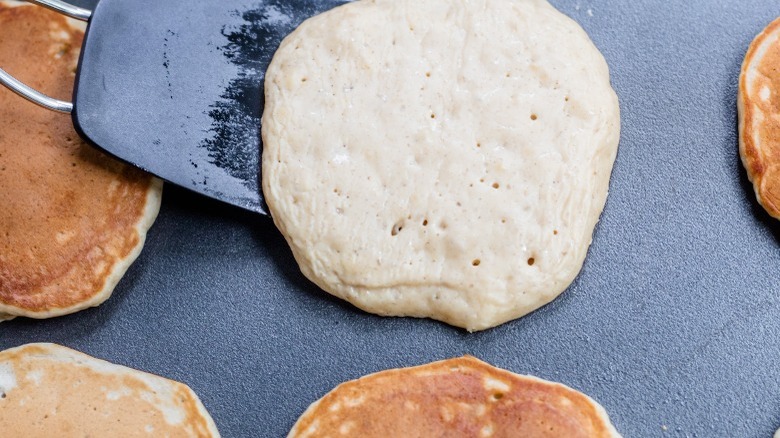 - Preheat a griddle or skillet over medium heat. Add the batter by ⅓ cup scoops. Cook the pancakes on one side for 3 to 4 minutes until they start to bubble on the surface. Flip and cook another 2 to 3 minutes.