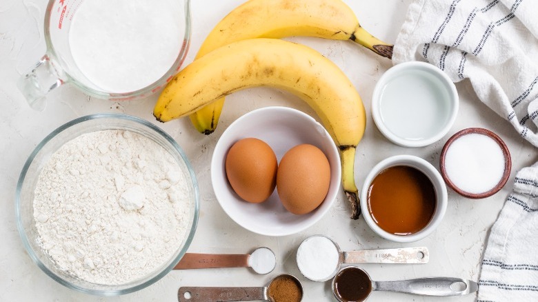 These banana pancakes are relatively simple to make, but the process will be even easier with a little preparation. Start by grabbing some ripe bananas, and then measure out some flour, baking powder, baking soda, salt, and cinnamon, if you want that flavor in your pancakes.
