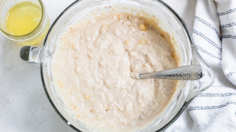 Now, it's time to put that special trick to use. Fold the egg whites into the batter, stirring until just combined. Then, let the batter sit and rest for 5 minutes.