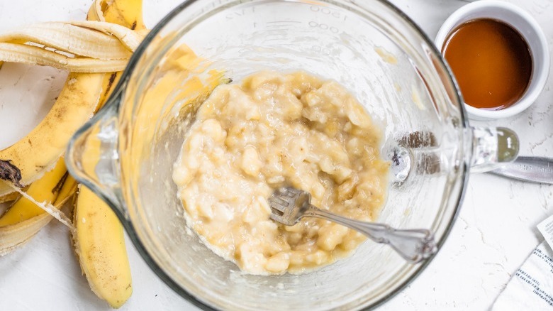 - Add the bananas to a large mixing bowl and mash with a fork until few chunks remain.