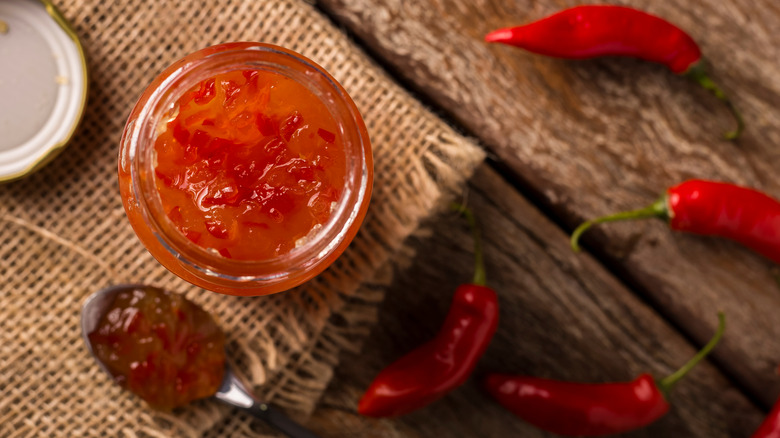 Pepper jelly is fairly popular, and jarred versions are available in most supermarkets, especially those down South. if you can't seem to find pepper jelly in your store, you can always make it from scratch. If you are looking to make a chili pepper alternative, it's best to go with a hot pepper jelly recipe. Simply add jalapeño, poblano peppers, and red bell pepper to a blender along with a cup of apple cider vinegar. Pulse blend until the peppers are finely chopped, and transfer the mixture to a saucepan with salt and sugar. Heat the mixture until the sugar fully dissolves, and add a tablespoon of pectin. Cook until the pectin is completely incorporated, then allow cooling.