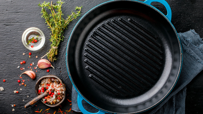 Just like with cast iron skillets, griddles need to be seasoned to keep them functioning properly. Seasoning doesn't mean literally putting various spices on the skillet but rather using certain oils to create a seal around the material to preserve the quality of the iron and keep its non-stick qualities, per MasterClass. Just coat the cast iron griddle in a thin layer of flaxseed oil and put it into the oven to seal the grease to the iron.
