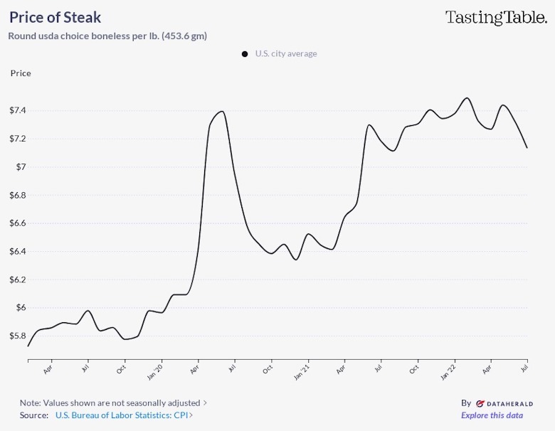 In 2021, the average price per pound of round steak cost consumers $6.97, and prices continued to rise along with inflation into the next year. Although round steak prices have hovered above $7 throughout 2022, shoppers have seen a 3.35% decrease in the price per pound from January to July of 2022. Lean times call for leaner cuts of steak, and savvy shoppers can celebrate small food inflation victories with a round steak that won't break the bank.