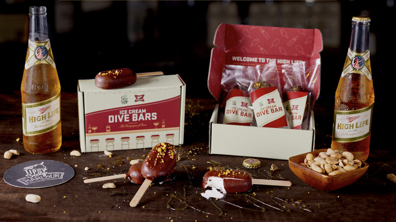 Here's a mash-up we didn't see coming: To celebrate the 100th anniversary of the ice cream bar, Miller High Life is partnering with Tipsy Scoop to create a limited-time beer-infused frozen snack. Here's the hook: Miller High Life embraces its reputation as a popular choice among dive bar patrons (via Men's Journal), so why not celebrate ice cream bars by creating a dive-bar-inspired flavor?