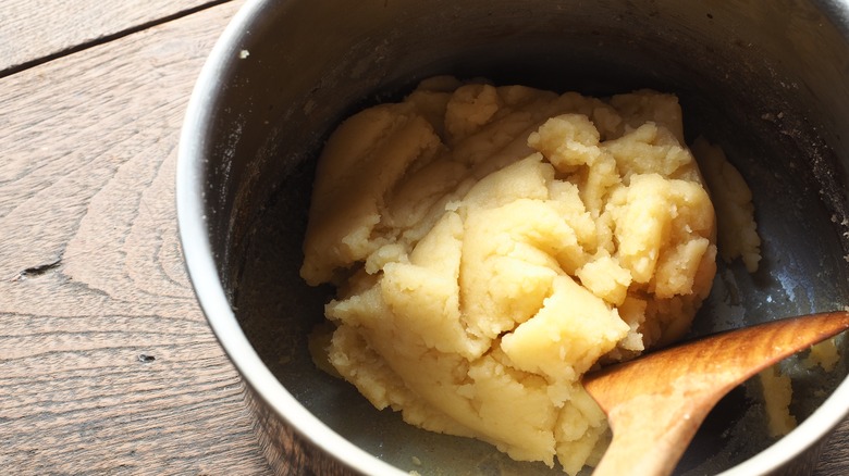 As The Spruce Eats explains, the basic recipe for choux pastry is simply flour, water, butter, and egg. The egg serves as the leavening agent, giving choux pastry its signature airy texture. To make choux, first combine the flour, butter, and water on the stovetop, then add the egg and bake in a piping hot oven. Food Crumbles notes that timing is crucial when it comes to choux pastry: If you take it out of the oven too soon, it'll deflate. It's important to give the proteins in the eggs time to properly set, ensuring that the pastry holds its shape.