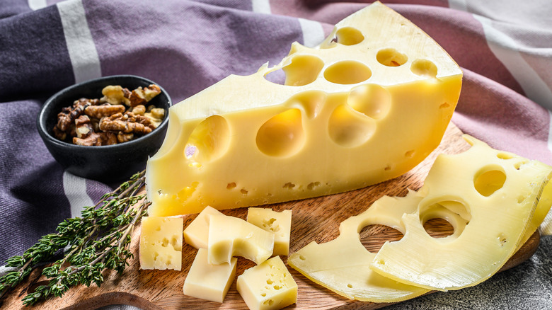 What most Americans know as Swiss cheese is a variety that is based on the Swiss style known as Emmental, per Cheese.com. Swiss cheese is best known for its slightly nutty and sweet flavor, and uniquely perforated pattern. Brewster Cheese notes that this structure of interior holes is due to bubbles of carbon dioxide that are produced during the maturing process.