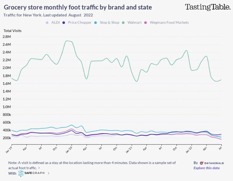 Not by a long shot. According to data compiled by Tasting Table, big-box chain Walmart is actually New Yorkers' favorite grocery store. Compared to popular chains Aldi, Price Chopper, Stop & Shop, and beloved Wegmans, foot traffic at Walmart stores in the state is way, way, way higher: We're talking over 1,650,000 total visits per month since the start of data collection in 2019, with some months seeing as many visits as 2,249,738 (August 2021) and 2,300,806 (April 2022).