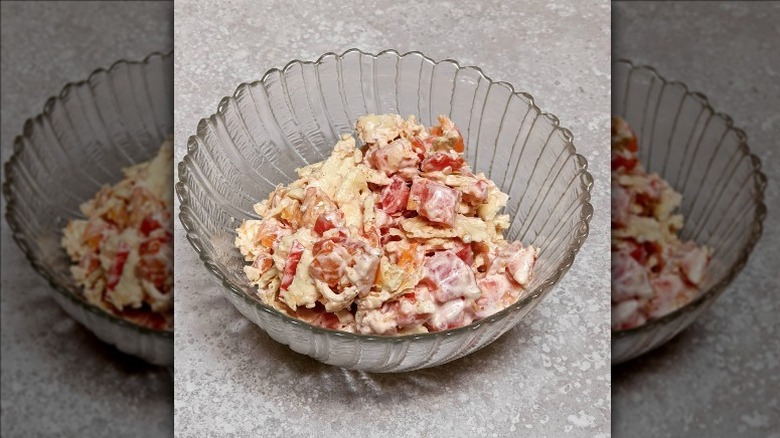 If you want to keep things really basic, you can simply crush up some saltine crackers and add them to some chopped tomatoes dressed with mayonnaise, as one Instagram user did. You don't have to stick to saltines, though. Oyster crackers and cheesy crackers make an excellent addition to all types of salads, and they soak up any of your extra dressing beautifully. You can even branch out even more. Why not add chips, pretzels, or other crunchy snack foods to your salads? It's one of the easiest ways to take your salad to the next level and prevent you from getting bored with the average cafeteria salad bar.