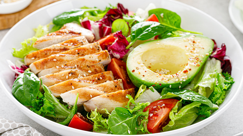 Sometimes, you want a salad that's nice and light and all about the fruits and veggies. Other times, though, you need something that feels a little more substantial. This is where proteins like meat, seafood, and vegetarian options come into play. Adding protein to your salads can bulk them up and make them more filling while adding a ton of flavor in the process. Luckily, it's especially easy to add protein to your dining hall salad because you have plenty of cooked protein options at your disposal.