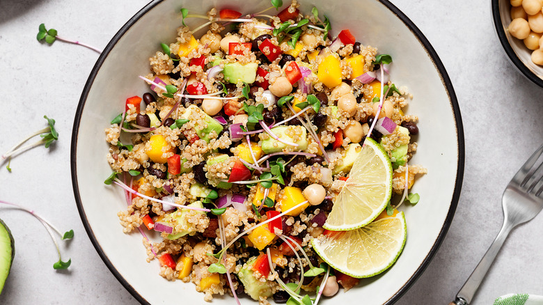 Again, just because you're eating a salad doesn't mean that you have to resort to plain rabbit food and nothing else. If the thought of choking down a huge bowl of salad greens alone makes you want to opt for a pizza instead, know that you can start building your salad with grains. Quinoa is a fantastic base for salads, especially when you mix it with greens. Rice is also a good option if you're looking for something on the heartier side. And if you ask us, pasta is one of the best salad bases out there. It helps soak up all the extra dressing, and it's usually fantastic when paired with fresh veggies.