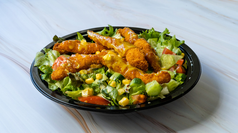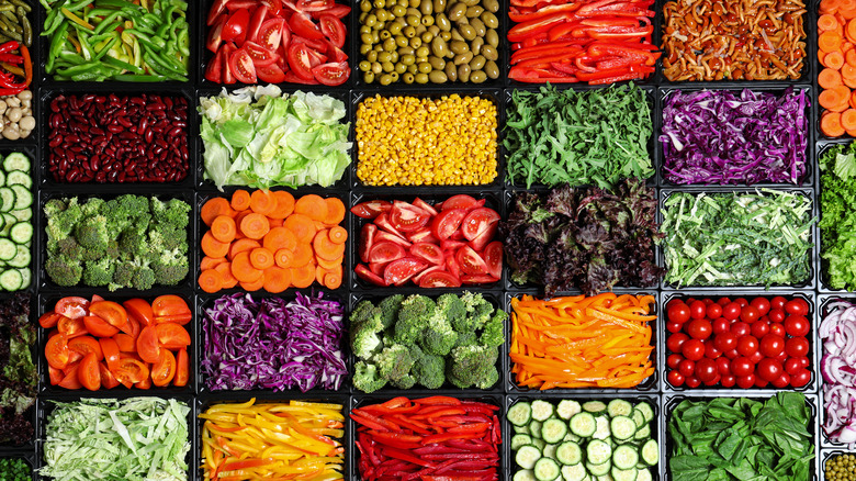 If you don't eat meat or would just prefer a veggie-centric meal, you can add protein to your salad by sprinkling on the beans or adding some tofu to the mix, according to Insider. Many dining halls have a variety of other meat-free protein options like veggie patties and tempeh as well. Of course, you can indulge in meat if you prefer. Grilled chicken is always a safe bet, but don't be afraid to use shrimp or other types of seafood, steak, or even pulled pork if that's what you prefer and they're available. Bacon bits, ham, and other cold cuts are classics as well, and they are perfect for cold salads. Again, if you don't limit yourself to what you find at the salad bar, you have pretty much limitless options here.