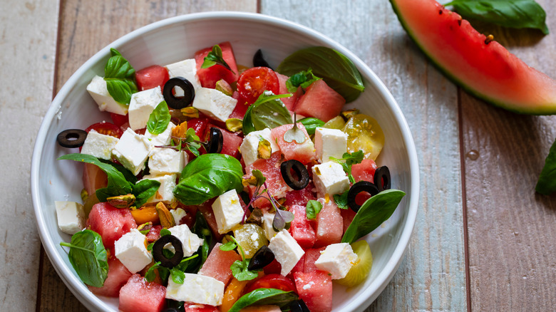 Many salad bars feature plenty of fruit, and you can easily build your salad around those options. Even if you have to go elsewhere in the dining hall to find the fruit you're looking for, berries, oranges, melons, and a variety of other fruits can serve as a deliciously sweet, refreshing, and juicy base for a salad. You can keep it simple and just opt for a plain fruit salad, but adding flavorful greens like arugula or herbs like parsley transforms a fruit salad into a savory dish. We think that salty, vinegar-based sauces work well — try a homemade basic vinaigrette — with these kinds of fruit-based salads, but don't be afraid to get creative and try something new.