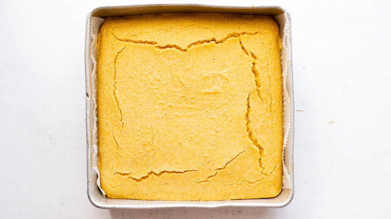 - Pour the batter into the lined pan and bake for 15 minutes. The cornbread is done baking when an inserted toothpick comes out clean.