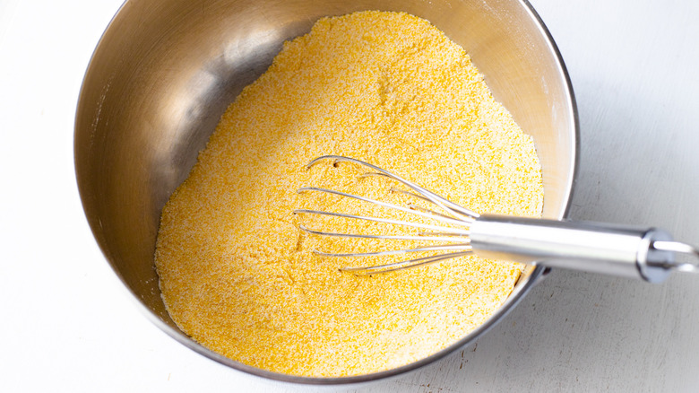- In a mixing bowl whisk together the cornmeal, flour, sugar, baking powder, baking soda, and salt.