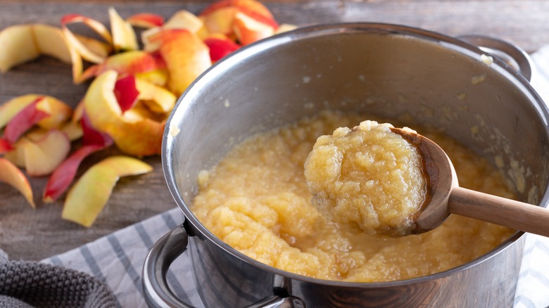 While many people may rush to complex baking options like apple pie or turnover, which require making pastry doughs, another less obvious idea may go overlooked: homemade applesauce. Although applesauce may seem like one of those staple foods that's just easier to go buy in a jar at the store, The Daily Meal notes that this kid-favorite side dish is healthier, more natural, and better tasting when made at home, and — if the apples aren't too expensive — comes with a negligible price difference. According to Southern Living, all you need to make this sweet treat right at home are apples, a sweetener of your choice, and a dash of lemon.