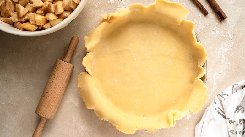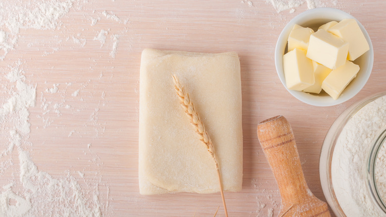 For laminated pie dough, there isn't a need to roll the butter in between each layer of your dough. According to King Arthur Baking Company, all that you need to do is include lots of fat in your mix, and then give it a simple fold. Yahoo News also notes it's important to work with chilled pie dough, so make sure it has spent some time in the fridge before you get started. Roll the pie dough out into an 8- x 10-inch rectangle. Then fold the dough over itself in thirds like a letter going into an envelope. Then, flip the dough, rotate it 90 degrees, and repeat the process of rolling it out and folding it. Finally, wrap the dough in plastic, and refrigerate it for at least 30 minutes before using it.