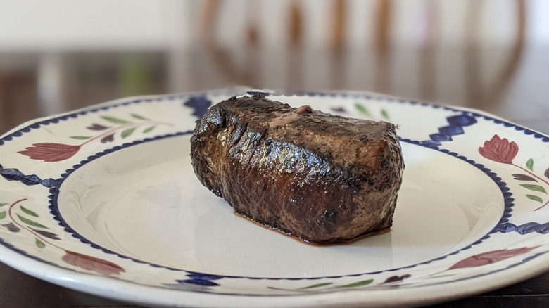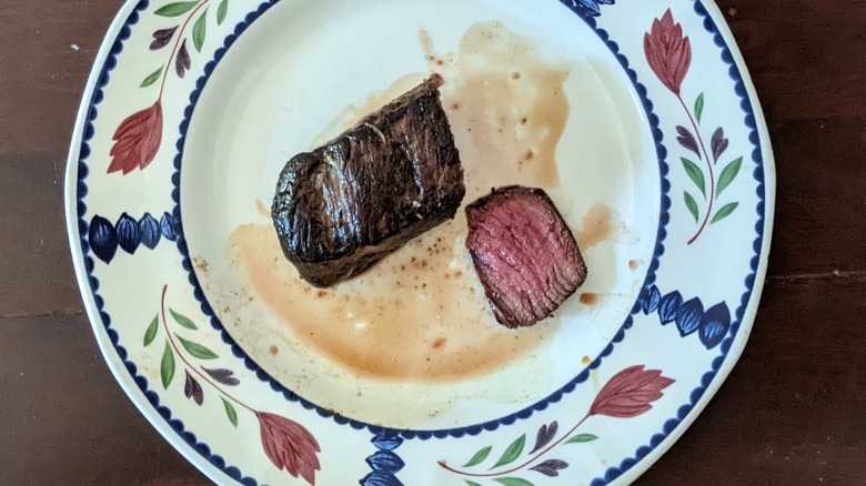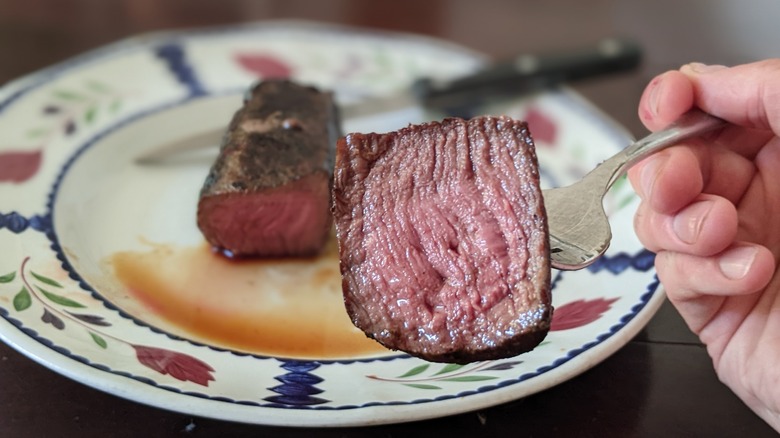 Its steak fibers surprised twice: first by being more rugged than expected across the grain, then more tender than the former would imply cutting with it. This was true even of the filet mignon. None of this was unpleasant and may have even factored into the real selling point; exceptional flavor from well-developed muscle. But if you're expecting a buttery soft filet mignon, be aware this is the musculature of an animal living an active life. You may find this quality poignant in the flatiron, which is not entirely surprising, but it is the more tender half of the blade roast.