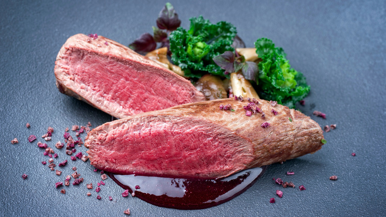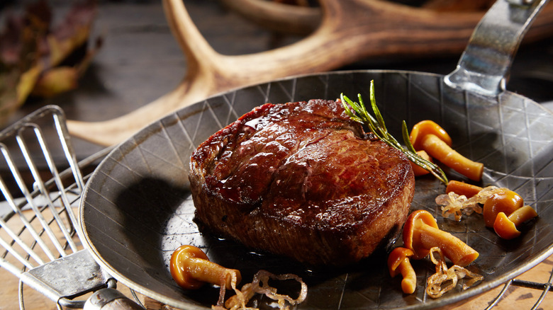Simply put, overcooking venison will result in a potentially rubbery piece of meat with a gamey flavor (via Southern Living). You may have already heard others describe venison and other hunted animals as "gamey" and wondered what it meant. It can mean a couple of things, according to the hunting blog Honest-Food. Most standard, store-bought meat has been fed a diet of corn which gives the meat a very mild flavor that most people are used to. Because wild game animals like deer subsist on a variety of things like acorns, herbs, and grasses, the flavor is richer and fuller, or a bit "gamey." This isn't necessarily bad, just different and quite pleasant for anyone who enjoys a flavorful piece of meat.