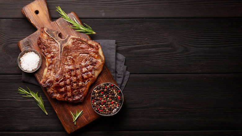 But where does it come from? Well, there's this section of the cow called the loin primal, which is right underneath the backbone, according to Beef. It's What's For Dinner. Now if we look towards the front area of the loin primal, we'll see a section called the short loin subprimal, which is home to the loin steak tail, bone-in strip loin, and the T-bone steak. The T-bone can either be separated into its parts, the New York strip and the filet mignon, or left intact for those who like large cuts of steak.