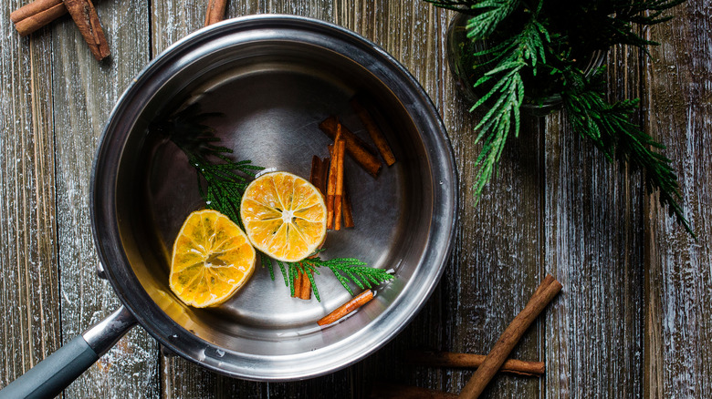 Homestead and Chill states that simmer pots can be made with water and an array of natural ingredients, some of which are spices you likely already have in your pantry: rosemary, thyme, cinnamon sticks, bay leaves, and star anise. You can also use citrus peels or zest, fresh cranberries, or apple slices for a fruity note, or even some pine if you happen to have it. Mix these in a pot of water and simmer for at least 15 minutes to remove any unpleasant kitchen smells.