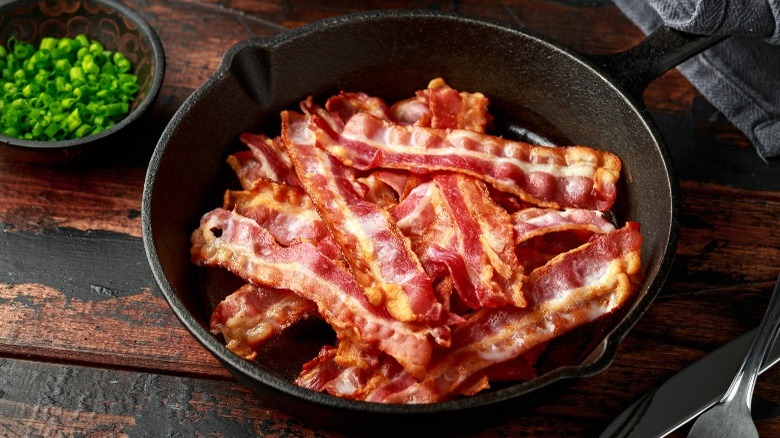 While it's in everyone's best interest to adhere to USDA food safety guidelines for the safe handling and cooking of bacon, that doesn't mean rushing your precious streaky bacon slices into a positively incendiary pan. The reason — as GQ points out, good bacon is equal parts meat and fat. That 50/50 split makes for deliciously crisp and chewy, fat-infused flavor when cooked properly, but it works against you when your bacon is cold (or your pan is too hot).