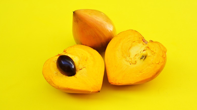Canistel is notable for its rich variety of alternative names. This means the fruit has more aliases than a career criminal. As Morton observes, it's called zapote amarillo in Colombia, zapotillo in Costa Rica, zapotillo de montana in Guatemala, and mamey cerera in Belize, among many other "noms de fruit." Canistel's best-known handle, however, is derived from its color. The fruit's skin is yellow, but its flesh is a bright orangish yellow, a hue which has drawn comparisons to egg yolks, per Britannica. Hence, in addition to its many other names, canistel is also commonly known as eggfruit.
