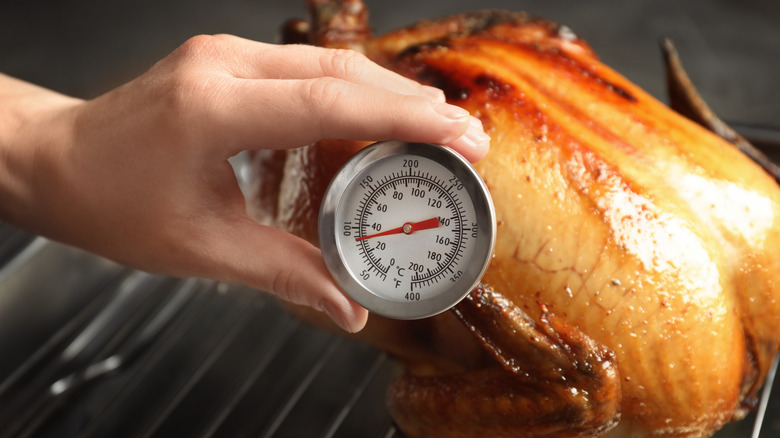 Serious Eats doesn't recommend using a leave-in probe thermometer, because it's reliant on a single point of the meat. You can guess that the center is where your probe should rest, but you'll still need to double-check. For example, Butterball recommends leaving a thermometer in the turkey's thigh for an accurate reading. However, this isn't guaranteed to be the turkey's coolest point.
