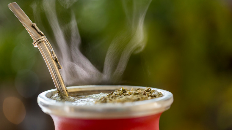 Per Food & Wine, the name "yerba mate" (pronounced YUR-buh MAH-tay) translates to "gourd herb." A "mate" is a type of dried gourd, and the beverage is traditionally consumed from a hollowed-out gourd through a special straw called a "bombilla." When the Guarani Indians first discovered yerba mate, says Mate-tee, they used a stick of natural sugar cane as a straw. Bombillas are specifically designed to filter out the tea leaves, and they should only be used for sipping (Matero claims this could ruin the tea). The final tool in the yerba mate drinking ritual is a thermos. Traditionally, groups of people share the drink together someplace outdoors, like a park, so hot water would need to be transported (via Food & Wine).