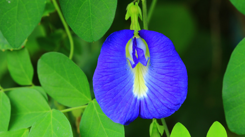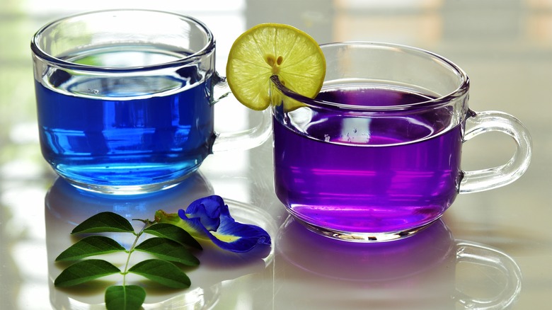 CBC explains that the butterfly pea flower is produced by the Clitoria ternatea vine. The flowers, according to Artful Tea, are commonly grown in Southeast Asia, and they're used to brew a tea that's the most brilliant blue you've ever seen in a glass. But why does the New York Times call butterfly pea flower a "mood-ring ingredient?" That bright blue color is only part of the flower's appeal. When you add an acidic ingredient like lemon juice to the butterfly pea flower tea, the blue color transforms to violet, just like magic.