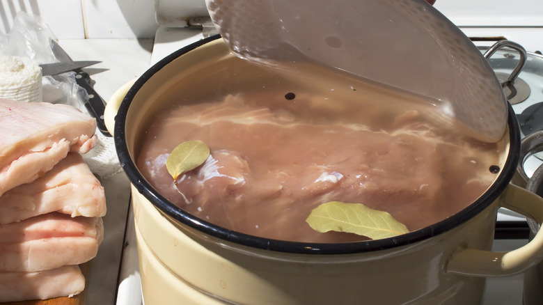Aside from wasting your time, over-brining can also wreak havoc on the structure of your meat. In order to avoid making your meat a mushy mess, Taste of Home suggests brining for one hour, each pound. As long as you haven't let your pork or poultry sit in brine for days, you can simply remove excess salt by soaking the meat in cold water.