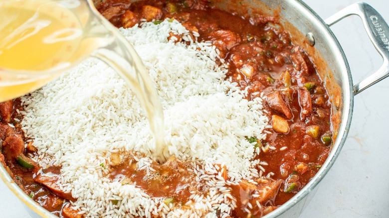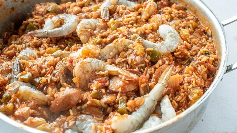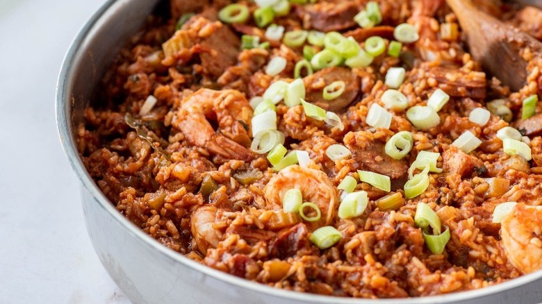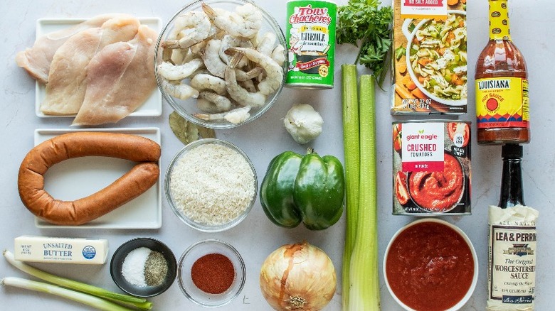 While jambalaya is an easy, one-pot meal, it requires a lot of ingredients to achieve its delicious end result. First, you will need long-grain rice. You'll also need chicken cut into bite-sized pieces, thinly sliced andouille sausage, butter, and seasonings like salt, pepper, and cayenne.