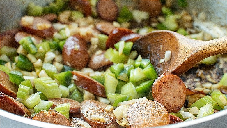 - Once the onion begins to soften, add the bell pepper and celery and cook until the trinity is softened, about 3 to 4 minutes. Stir in the garlic.
