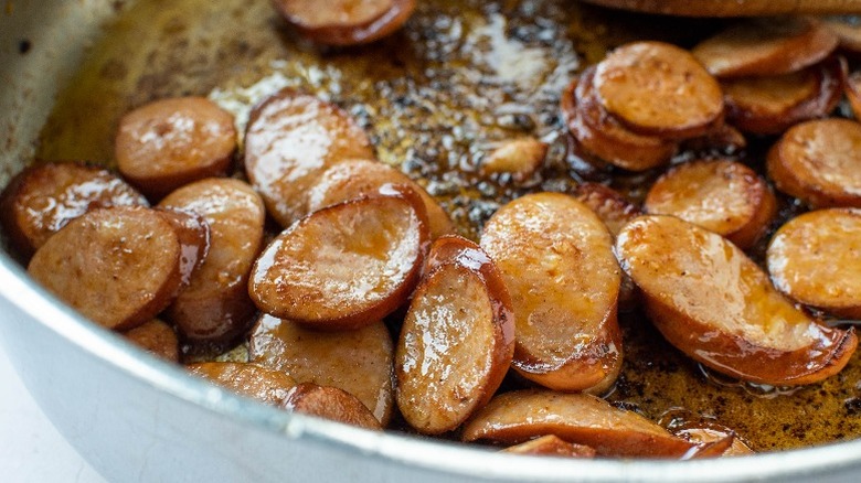 - Add sliced sausage to the pot and cook until caramelized, about 5 minutes, scraping up any browned bits and seasoning leftover from the chicken.