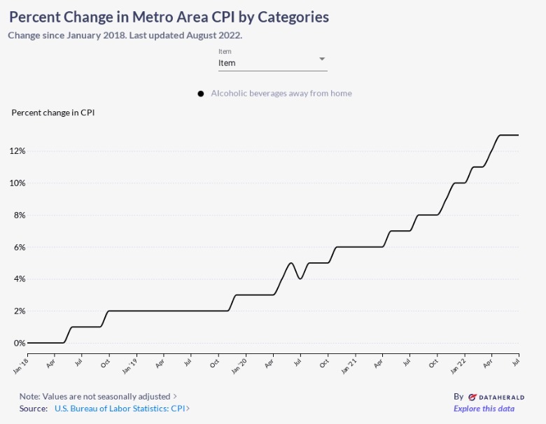 The price of getting together with friends for drinks rose slightly in 2018, remaining at a solid 2% increase in 2019. A year later prices would more than double to 5% and continue to rise steadily from there. By the end of 2021, prices would double yet again to a 10% increase, and as of July this year, costs have already risen another 3%.