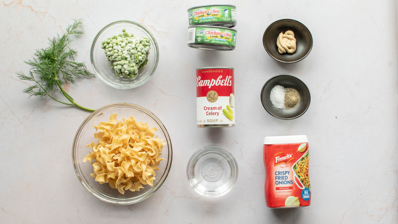 To make this casserole, you'll need condensed cream of celery soup, water, water-packed tuna, salt, pepper, Dijon mustard, frozen peas, egg noodles, fresh dill, and the kind of crunchy fried onions that come in a can or a pouch.
