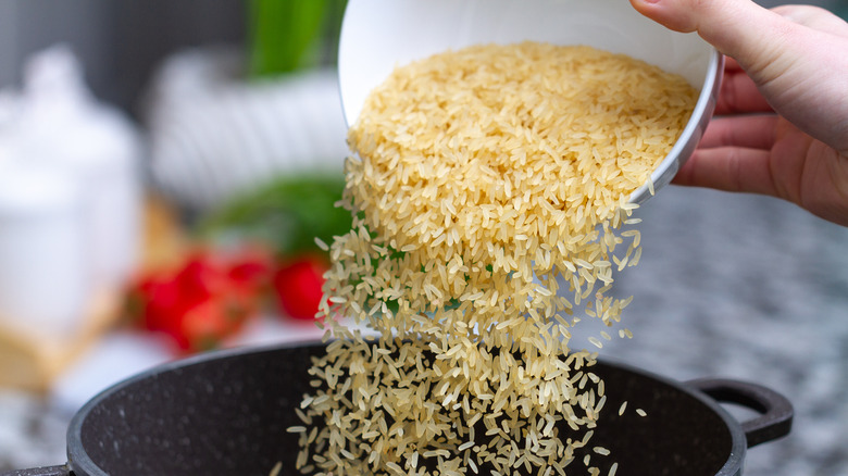 One of the most common, aside from actually adding seasoning, is to simply toast the rice. As the Los Angeles Times explains, many rice-based recipes call for toasting the dry grains in a pan before adding water. In the same way that toasting spices and nuts intensifies their aromas and flavors, toasting rice brings out its natural nuttiness. This extra step is an easy way to give plain rice a depth of flavor, but according to "Good Eats" host Alton Brown (via YouTube), there's one more thing you can do if you want to take that flavor a step further.