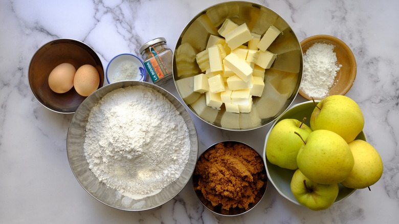 To make the pie crust, you will need brown sugar, eggs, flour, and salt. The filling is made from cornstarch, 4-spice powder, and more brown sugar in addition to peeled, chopped apples. To make this pie, Ngo says "I used golden [delicious] apples," but adds "You can also use a mix of red apples [like] gala and pink ladies."