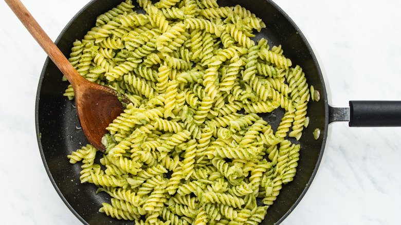- Add the pasta to a large frying pan with 2-3 tablespoons pesto. Heat on a medium setting, stirring for a couple minutes, until the pesto is warmed through and the pasta is completely coated.