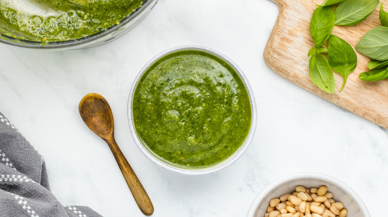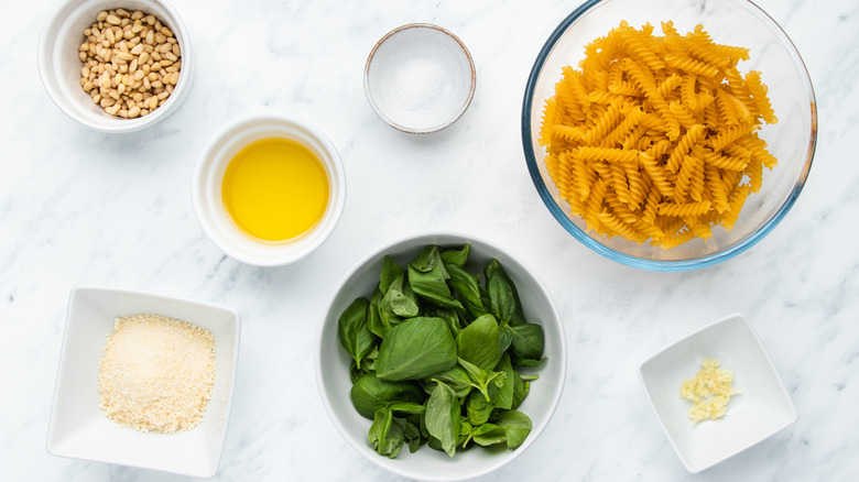 Gather the ingredients for classic basil pesto pasta