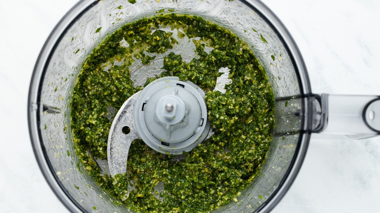 While the food processor is still running, slowly drizzle in what's left of the olive oil. Be sure to continue letting the food processor run until the oil is mixed in.