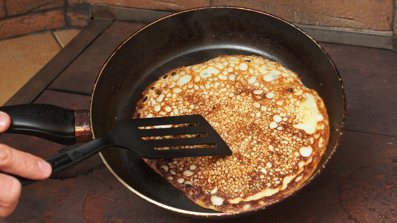No matter what you do to your pancake batter to make it airy, all of that effort can soon be destroyed if you're not careful when cooking it. It is crucial to keep in mind that you should never press down on cooking pancakes. This is because it will smash the air bubbles in the batter, creating a pancake that will end up flat. The tiny bubbles are also a fundamental signal in determining when to flip the pancakes, so they have more than one purpose. Rather than using your spatula to press on the pancakes, resist the urge to touch them while they're cooking.