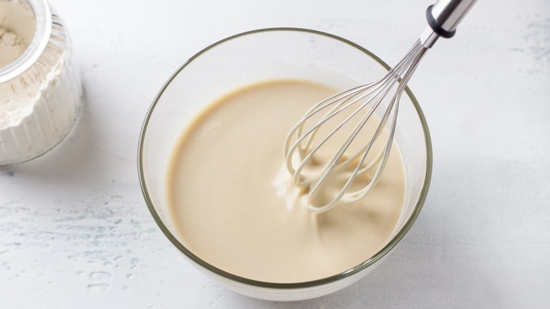 Although you might be asking yourself why you would put mayonnaise in your pancake batter, it is undoubtedly worth it because of its end result (and no, you won't be able to taste it). This surprising ingredient will help you get fluffier pancakes for several reasons. The first is that the acid in the mayonnaise activates the baking soda that's in your batter. Baking soda ultimately makes the pancake rise, so giving it a boost will help to ensure an even fluffier finish. Additionally, mayonnaise has egg whites, yolks, and oil, which contain fat that will prevent the pancake from being weighed down by a heavy batter.