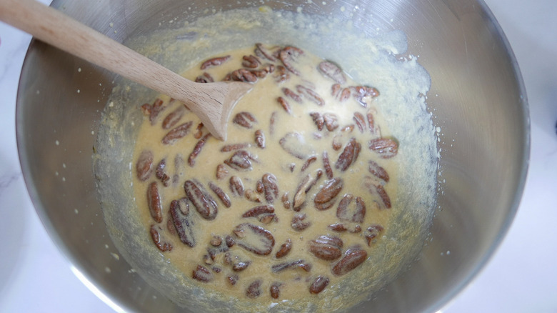 The last thing you need to add to the batter is the pecans. Instead of using an electric mixer (which will break up the pecans too much), be sure to use a spoon and mix them in by hand. Then, pour the mixture into the pie crust and pop it into the oven for 10 minutes.
