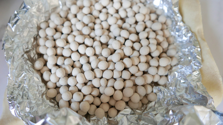 Line the pastry crust with parchment paper or foil and fill it with baking beans or pie weights to weigh it down. Then, pop the pie crust in the preheated oven for 15-20 minutes.